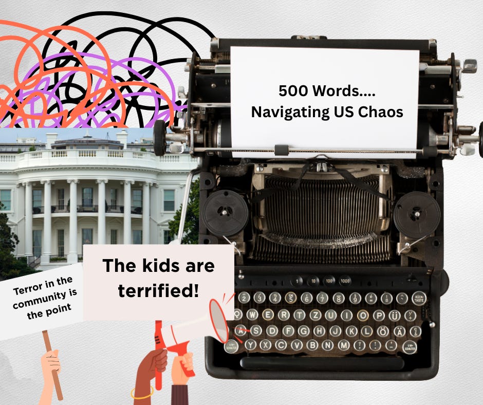 Ice is in this neighborhood. There’s been a couple high profile incidents within blocks. Everyone is scared. The New Trier kids (suburban high schoolers that have volunteered for 30 yrs) aren’t coming anymore because of ICE. It’s not that they don’t want to. Their parents are worried and don’t want them in the city. Especially here, so last week they quit. They’re going to try to raise some money for me instead, which would be nice but the kids need the relationships more. When ICE is gone they’ll come back, but not before.